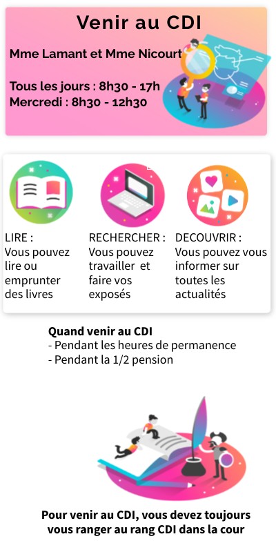 Quand venir au CDI - Pendant les récréations -Pendant les heures de permanence - Pendant la demi-pension (13h15-13h55)