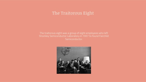 The traitorous eight was a group of eight employees who left Shockley Semiconductor Laboratory in 1957 to found Fairchild Semiconductor.