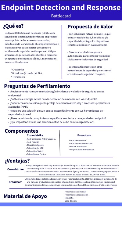 Endpoint Detection and Response (EDR) es una solución de ciberseguridad enfocada en proteger los endpoints de las amenazas avanzadas, monitoreando y analizando el comportamiento de los dispositivos para detectar y responder a incidentes de seguridad en tiempo real. Mitigan amenazas lo que ayuda a los clientes a mantener una postura de seguridad sólida. Las principales marcas utilizadas son: * Crowstrike* Broadcom (a través del PLA* Trendmicro