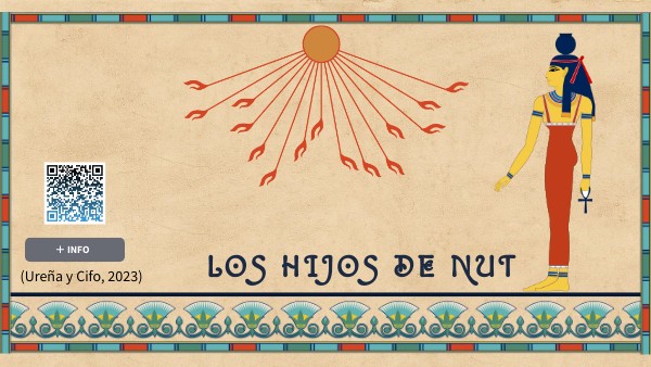 El docente indica a los niños que la diosa Nut está muy contenta. Ella, junto con sus cinco hijos realizarán diferentes danzas. Para llevar a cabo esta actividad, el docente previamente preparará dos dados: uno con la diosa Nut y sus cinco hijos asociando a cada uno de los personajes una parte del cuerpo y otro dado con los números de 1 al 6. El dado de los dioses tendrá representado a Osiris que indicará que se bailará con las piernas, Harmachis bailará con las manos pegadas a la pared, Seth bailará con la cadera, Isis bailará por el suelo y Neftis bailará con la cabeza. Si en el dado sale la diosa Nut se bailará libremente. El dado de los números tendrá asignado músicas con ritmos diferentes de Egipto. Desarrollo: los niños se distribuyen por el espacio de forma individual. Se lanzarán los dos dados, el dado de los dioses indicará la parte del cuerpo con la que hay que bailar y el dado de los números el tipo de música. Variantes: podemos cambiar la música, el tiempo, sugerir otras formas de danzar, etc.