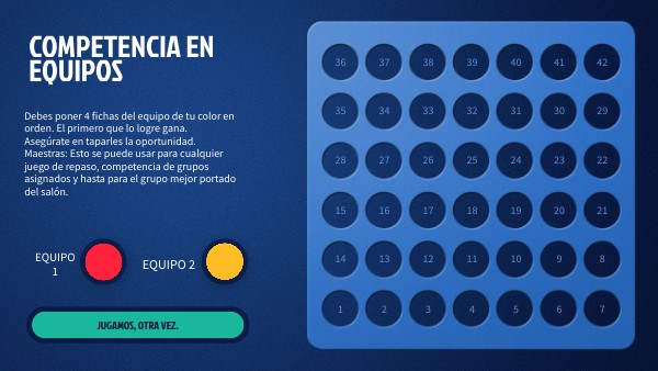 Debes poner 4 fichas del equipo de tu color en orden. El primero que lo logre gana. Asegúrate en taparles la oportunidad. Maestras: Esto se puede usar para cualquier juego de repaso, competencia de grupos asignados y hasta para el grupo mejor portado del salón.