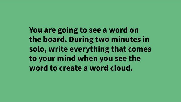 You are going to see a word on the board. During two minutes in solo, write everything that comes to your mind when you see the word to create a word cloud.