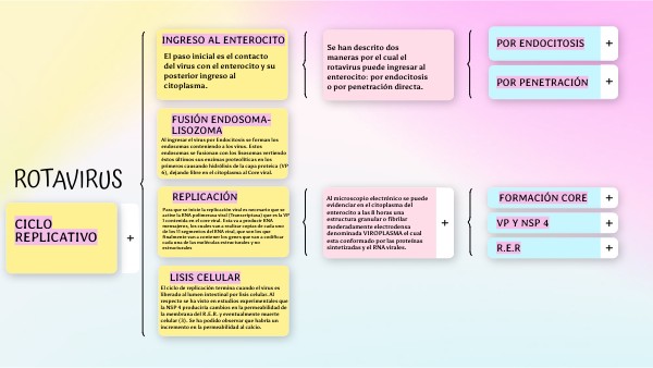 Al microscopio electrónico se puede evidenciar en el citoplasma del enterocito a las 8 horas una estructura granular o fibrilar moderadamente electrodensa denominada VIROPLASMA el cual esta conformado por las proteínas sintetizadas y el RNA virales.