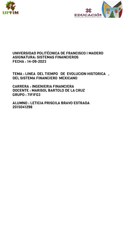 UNIVERSIDAD POLITÉCNICA DE FRANCISCO I MADERO ASIGNATURA: SISTEMAS FINANCIEROS FECHA : 14-09-2023 TEMA : LINEA DEL TIEMPO DE EVOLUCION HISTORICA , DEL SISTEMA FINANCIERO MEXICANO CARRERA : INGENIERIA FINANCIERA DOCENTE : MARISOL BARTOLO DE LA CRUZ GRUPO : 7IFIFG3 ALUMNO : LETICIA PRISCILA BRAVO ESTRADA 2015041298