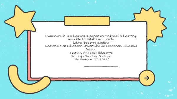 Evaluación de la educación superior en modalidad B-Learning, mediante la plataforma moodle Lilliana Becerril Santana Doctorado en Educación. Universidad de Excelencia Educativa México Teoría y Pr´sctica Educativa Dr. Hugo Sánchez Santiago Septiembre, 07, 2023