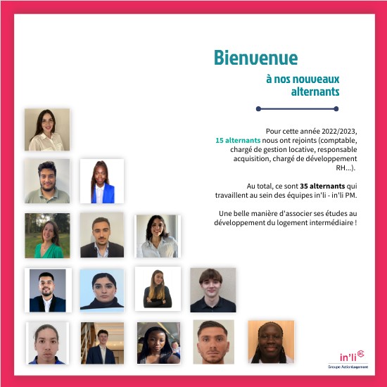 Pour cette année 2022/2023, 15 alternants nous ont rejoints (comptable, chargé de gestion locative, responsable acquisition, chargé de développement RH...). Au total, ce sont 35 alternants qui travaillent au sein des équipes in'li - in'li PM. Une belle manière d'associer ses études au développement du logement intermédiaire !