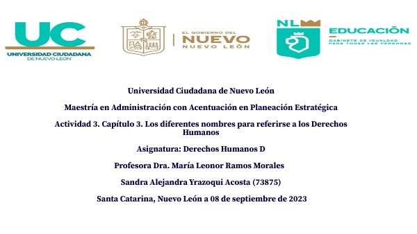 Universidad Ciudadana de Nuevo León Maestría en Administración con Acentuación en Planeación Estratégica Actividad 3. Capítulo 3. Los diferentes nombres para referirse a los Derechos Humanos Asignatura: Derechos Humanos D Profesora Dra. María Leonor Ramos Morales Sandra Alejandra Yrazoqui Acosta (73875) Santa Catarina, Nuevo León a 08 de septiembre de 2023