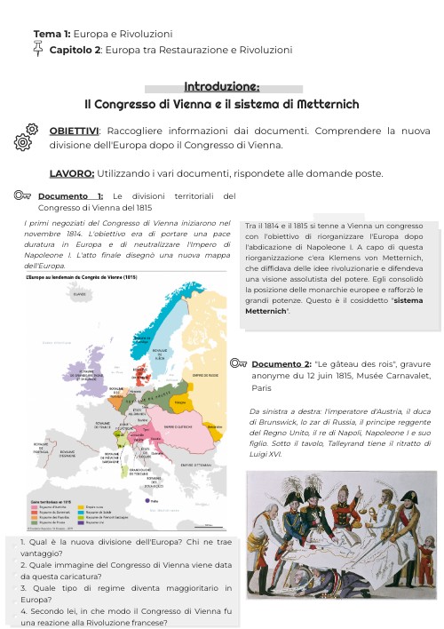 OBIETTIVI: Raccogliere informazioni dai documenti. Comprendere la nuova divisione dell'Europa dopo il Congresso di Vienna.LAVORO: Utilizzando i vari documenti, rispondete alle domande poste.