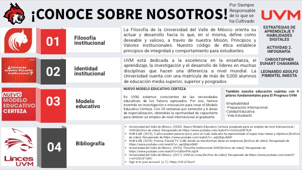- Universidad del Valle de México. (2016). Filosofía Institucional UVM [Archivo de video]. Recuperado de https://www.youtube.com/watch?v=UdGmPHrJqO4