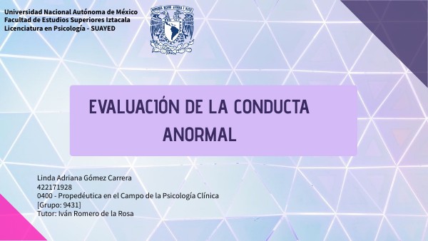 Linda Adriana Gómez Carrera 422171928 0400 - Propedéutica en el Campo de la Psicología Clínica [Grupo: 9431] Tutor: Iván Romero de la Rosa