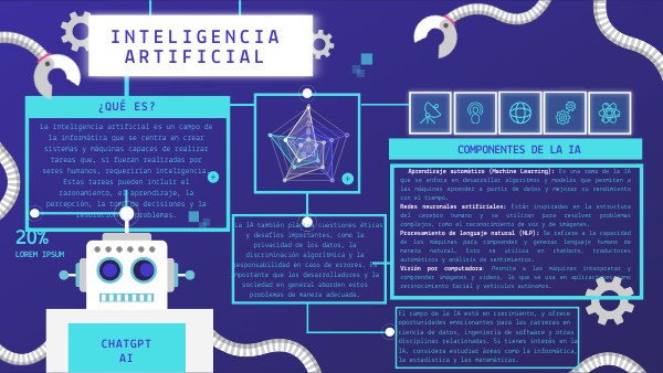 Aprendizaje automático (Machine Learning): Es una rama de la IA que se enfoca en desarrollar algoritmos y modelos que permiten a las máquinas aprender a partir de datos y mejorar su rendimiento con el tiempo. Redes neuronales artificiales: Están inspiradas en la estructura del cerebro humano y se utilizan para resolver problemas complejos, como el reconocimiento de voz y de imágenes. Procesamiento de lenguaje natural (NLP): Se refiere a la capacidad de las máquinas para comprender y generar lenguaje humano de manera natural. Esto se utiliza en chatbots, traductores automáticos y análisis de sentimientos. Visión por computadora: Permite a las máquinas interpretar y comprender imágenes y videos, lo que se usa en aplicaciones como reconocimiento facial y vehículos autónomos.