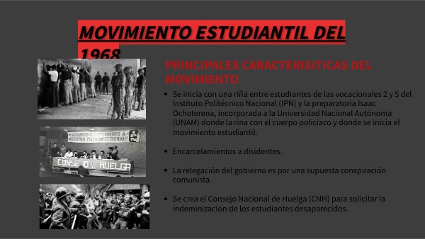 - Se crea el Consejo Nacional de Huelga (CNH) para solicitar la indeminizacion de los estudiantes desaparecidos.