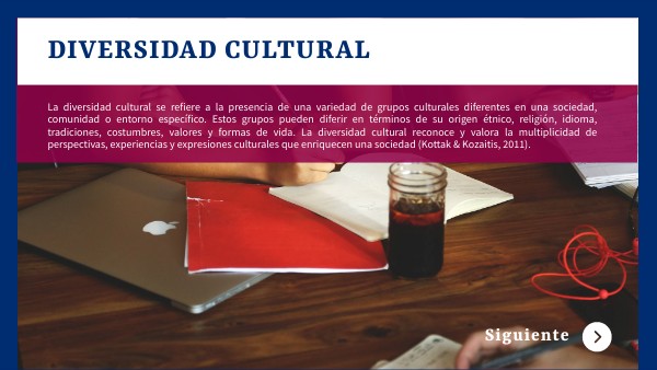 La diversidad cultural se refiere a la presencia de una variedad de grupos culturales diferentes en una sociedad, comunidad o entorno específico. Estos grupos pueden diferir en términos de su origen étnico, religión, idioma, tradiciones, costumbres, valores y formas de vida. La diversidad cultural reconoce y valora la multiplicidad de perspectivas, experiencias y expresiones culturales que enriquecen una sociedad (Kottak & Kozaitis, 2011).