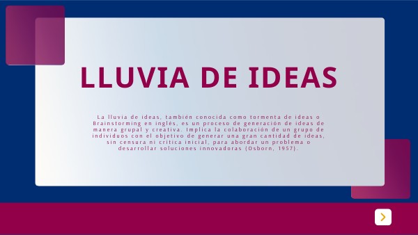 La lluvia de ideas, también conocida como tormenta de ideas o Brainstorming en inglés, es un proceso de generación de ideas de manera grupal y creativa. Implica la colaboración de un grupo de individuos con el objetivo de generar una gran cantidad de ideas, sin censura ni crítica inicial, para abordar un problema o desarrollar soluciones innovadoras (Osborn, 1957).