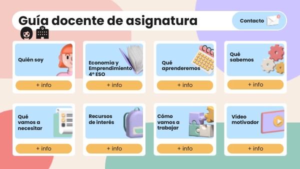 * Manual y apuntes elaborados por la profesora. (Pendientes de elección) * Plataforma Educamos CLM * Herramientas digitales, CANVA, Genially, Prezi * Cuentos para emprendedores * Enlaces a vídeos, noticias de contenido económico. TIC: * Ordenador