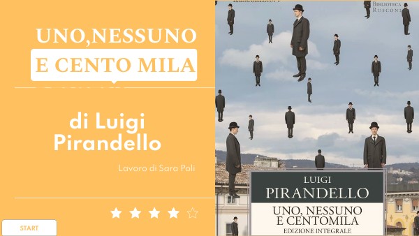 -Protagonista= Vitangelo Moscarda; -Usuraio; -Moglie Dida; -Crisi d'identità; -Cambiamento irrimediabile nella sua vita.