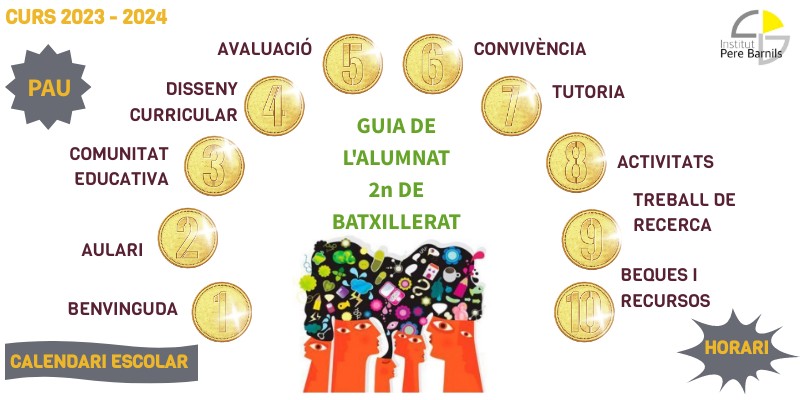 Primer de tot, el professorat que tindreu enguany i l’equip directiu de l’IES Pere Barnils us donem la benvinguda al 2n curs de batxillerat. Benvinguts, de nou, a l’institut! Que tingueu un bon curs!A batxillerat, i a 2n més que a 1r, aspectes com l’esforç conscient i decidit, la responsabilitat, el rigor i la perseverança, les ganes d’aprendre i l’organització personal, heu de situar-los en un primer pla. Sou estudiants.Ara mateix teniu a les mans una guia per a vosaltres (així com per a les vostres famílies) per orientar-vos en aquests primers dies de classe del nou curs i també, en alguns capítols, per tenir present durant tot l’any, informacions i consells que necessitareu i que us seran útils. A les pàgines següents hi trobareu el calendari del curs, l’horari, les aules, les assignatures, aspectes d’avaluació, un extracte de la normativa, informació sobre la tutoria, un resum d’activitats, informació sobre les PAU, etc. Per acabar, esperem que el curs comenci amb bon peu i que tots vosaltres, cadascú pel seu compte i a la seva manera, sapigueu aprofitar la magnífica oportunitat que se us brinda de poder fer un bon curs en tots els aspectes. Coratge i bona feina! Molta sort