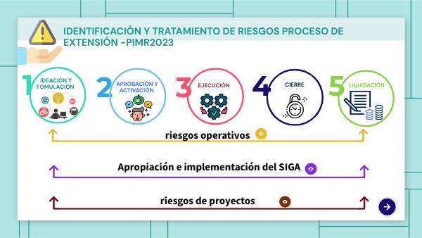 - Orientar a los docentes/directores de proyectos a idenficar, evaluar, controlar los posibles riesgos que se pueden materializar durante la ejecución de proyectos