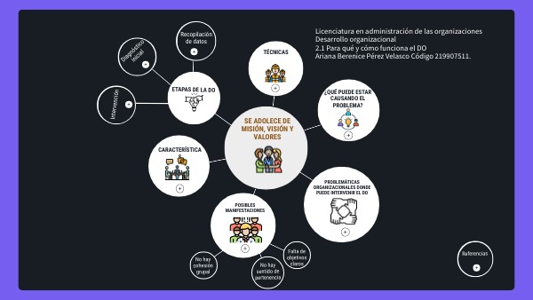El DO tiene como objetivo permitir que las personas puedan desarrollar sus talentos, dejar fluir su creatividad e innovación, elegí la problemática de “Se adolece de misión, visión y valores”. Porque en sí todas las empresas lo tienen, pero en algunos casos los empleados ni siquiera las conocen y estas son las bases para crear un sentido de pertenencia y una dirección clara y enfocada de los objetivos.