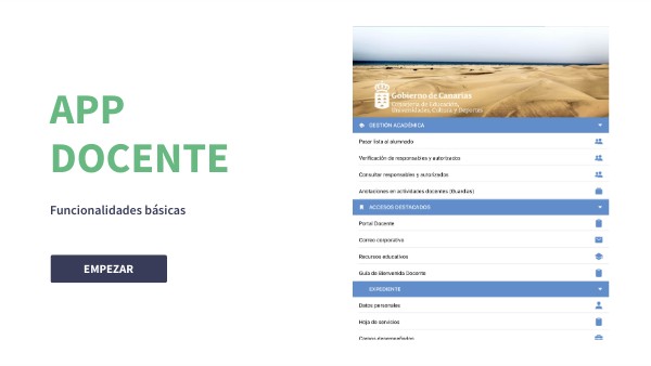 A través de la App Docente del Gobierno de Canarias podemos actualmente realizar diversas gestiones de nuestro interés. En este documento vamos a destacar las que usaremos en el centro y algunas que pueden ser de interés para el profesorado.