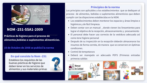 Los principios son aplicables a los establecimientos que se dediquen al proceso de alimentos, bebidas o suplementos alimenticios que deben cumplir con las dispociones establecidas en la NOM.