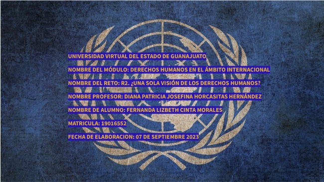 UNIVERSIDAD VIRTUAL DEL ESTADO DE GUANAJUATO NOMBRE DEL MÓDULO: DERECHOS HUMANOS EN EL ÁMBITO INTERNACIONAL NOMBRE DEL RETO: R2. ¿UNA SOLA VISIÓN DE LOS DERECHOS HUMANOS? NOMBRE PROFESOR: DIANA PATRICIA JOSEFINA HORCASITAS HERNÁNDEZ NOMBRE DE ALUMNO: FERNANDA LIZBETH CINTA MORALES MATRICULA: 19016552 FECHA DE ELABORACION: 13 DE ENERO DEL 2024