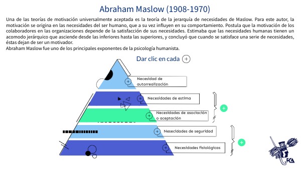 Una de las teorías de motivación universalmente aceptada es la teoría de la jerarquía de necesidades de Maslow. Para este autor, la motivación se origina en las necesidades del ser humano, que a su vez influyen en su comportamiento. Postula que la motivación de los colaboradores en las organizaciones depende de la satisfacción de sus necesidades. Estimaba que las necesidades humanas tienen un acomodo jerárquico que asciende desde las inferiores hasta las superiores, y concluyó que cuando se satisface una serie de necesidades, éstas dejan de ser un motivador. Abraham Maslow fue uno de los principales exponentes de la psicología humanista.