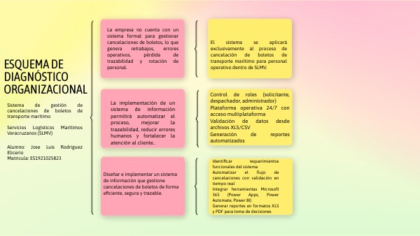 Identificar requerimientos funcionales del sistema Automatizar el flujo de cancelaciones con validación en tiempo real Integrar herramientas Microsoft 365 (Power Apps, Power Automate, Power BI) Generar reportes en formatos XLS y PDF para toma de decisiones