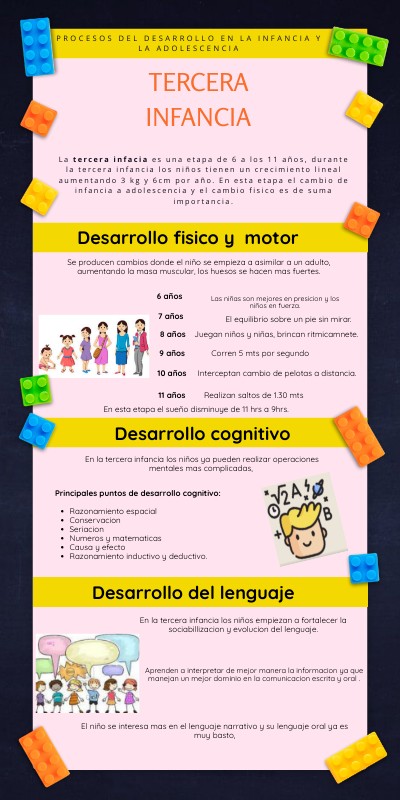 La tercera infacia es una etapa de 6 a los 11 años, durante la tercera infancia los niños tienen un crecimiento lineal aumentando 3 kg y 6cm por año. En esta etapa el cambio de infancia a adolescencia y el cambio fisico es de suma importancia.