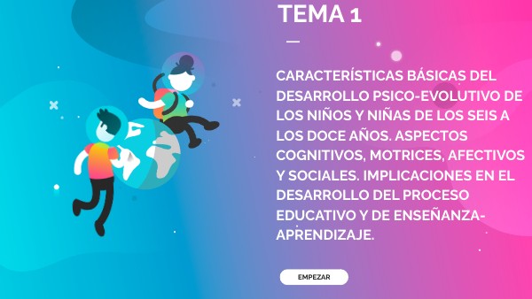 La infancia constituye la primera fase del desarrollo humano, la cual, se producen cambios cuantitativos y cualitativos en los diferentes aspectos de la persona, que configuran sus características y potencian sus capacidades. Las características básicas del desarrollo evolutivo se apoyan en el análisis de los diferentes ámbitos de la persona: cognitivo, motor, afectivo y social. La LOMLOE Ley Orgánica 3/2020, de 29 de diciembre, resalta además la universalización de los conocimientos y las competencias que permitan aprender a todos los alumnos y alumnas a lo largo de la vida y faciliten su plena participación social y laboral. En este tema abordaremos las características básicas del desarrollo psicoevolutivo de los niños y niñas de los seis a los doce años, analizándose las implicaciones educativas, didácticas y metodológicas que se desprenden de este conocimiento. En el desarrollo de este tema se tendrá en cuenta la aplicación de LOMLOE y el Real Decreto 157/2022 así como su desarrollo curricular en la Comunidad Autónoma de Andalucía.