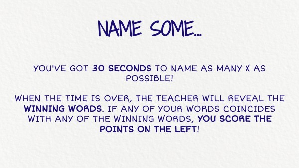 YOU'VE GOT 30 SECONDS TO NAME AS MANY X AS POSSIBLE! WHEN THE TIME IS OVER, THE TEACHER WILL REVEAL THE WINNING WORDS. IF ANY OF YOUR WORDS COINCIDES WITH ANY OF THE WINNING WORDS, YOU SCORE THE POINTS ON THE LEFT!