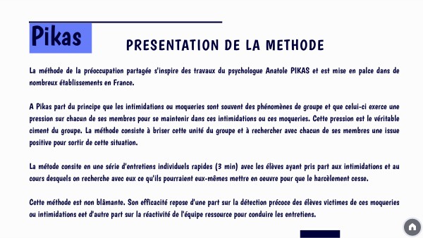 La méthode de la préoccupation partagée s'inspire des travaux du psychologue Anatole PIKAS et est mise en palce dans de nombreux établissements en France. A Pikas part du principe que les intimidations ou moqueries sont souvent des phénomènes de groupe et que celui-ci exerce une pression sur chacun de ses membres pour se maintenir dans ces intimidations ou ces moqueries. Cette pression est le véritable ciment du groupe. La méthode consiste à briser cette unité du groupe et à rechercher avec chacun de ses membres une issue positive pour sortir de cette situation. La métode consite en une série d'entretiens individuels rapides (3 min) avec les élèves ayant pris part aux intimidations et au cours desquels on recherche avec eux ce qu'ils pourraient eux-mêmes mettre en oeuvre pour que le harcèlement cesse. Cette méthode est non blâmante. Son efficacité repose d'une part sur la détection précoce des élèves victimes de ces moqueries ou intimidations eet d'autre part sur la réactivité de l'équipe ressource pour conduire les entretiens.
