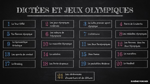 J1 : une manifestation unique au monde – la première fois – tous les quatre ans – des centaines de millions de personnes – les meilleurs athlètes mondiaux – une compétition exceptionnelle – la cérémonie d’ouverture – la flamme olympiqueJ2 : Les JO sont organisés tous les quatre ans – Ils réunissent les meilleurs athlètes mondiaux – Les athlètes défilent dans le stade J3 : Les JO n’ont été annulés que trois fois – Ils sont suivis par des centaines de millions de personnes – Le drapeau des anneaux olympiques flotte dans le ciel