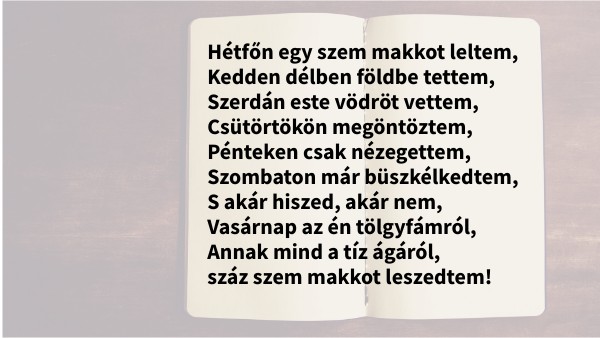 Hétfőn egy szem makkot leltem, Kedden délben földbe tettem, Szerdán este vödröt vettem, Csütörtökön megöntöztem, Pénteken csak nézegettem, Szombaton már büszkélkedtem, S akár hiszed, akár nem, Vasárnap az én tölgyfámról, Annak mind a tíz ágáról, száz szem makkot leszedtem!