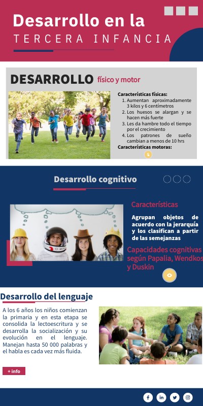A los 6 años los niños comienzan la primaria y en esta etapa se consolida la lectoescritura y se desarrolla la socialización y su evolución en el lenguaje. Manejan hasta 50 000 palabras y el habla es cada vez más fluida.
