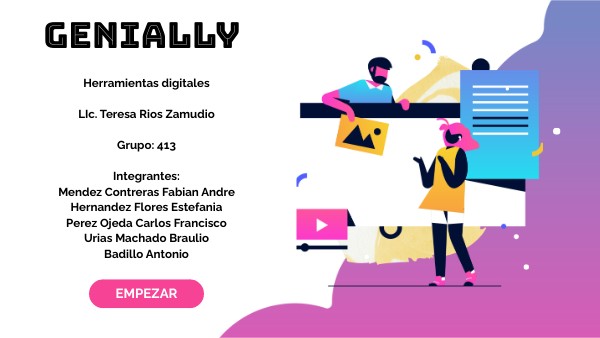 Es una herramienta que nos permite generar contenidos digitales interactivos sin necesidad de programar y sin tener conocimientos de diseño.Podemos diseñar infografías, presentaciones o mapas con el típico interfaz de "arrastrar y soltar" El punto fuerte de Genial.ly, a diferencia de Canva y Piktochart, es la interactividad, pero ten en cuenta que esta aplicación está pensada para diseñar contenidos en formato digital que puedas incrustar en páginas web o mostrar online, y no para diseñar creatividades que quieras imprimir en formato papel