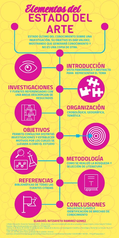 -Lifeder Educación. [Canal de Youtube]. (2021, 30 de enero). ¿Que es el estado del arte de un proyecto, trabajo o tesis y como hacerlo? [Video]. Youtube. https://www.youtube.com/watch?v=YXT3ajbcY0E-Urbina, A., & Morel, M. (2018). El estado del arte / estado de la técnica y la Investigación Científica y Tecnológica. Portal De La Ciencia, 13, 3–7. https://doi.org/10.5377/pc.v13i0.5916 -León. A., (2013). Cómo hacer un estado de la cuestión. chrome-extension://efaidnbmnnnibpcajpcglclefindmkaj/https://reunir.unir.net/bitstream/handle/123456789/1187/EC_TFG.pdf?sequence=1
