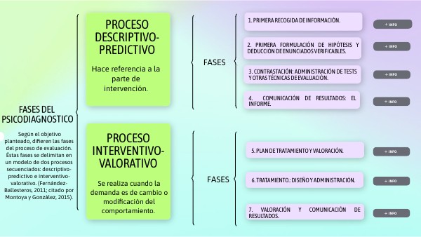 Según el objetivo planteado, difieren las fases del proceso de evaluación. Éstas fases se delimitan en un modelo de dos procesos secuenciados: descriptivo-predictivo e interventivo-valorativo. (Fernández-Ballesteros, 2011; citado por Montoya y González, 2015).
