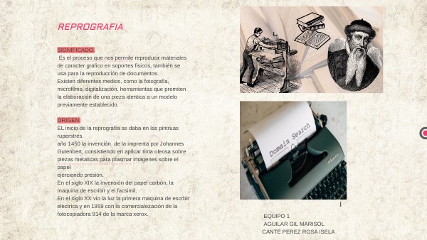 SIGNIFICADO. Es el proceso que nos permite reproducir materiales de caracter grafico en soportes fisicos, también se usa para la reproducción de documentos.Existen diferentes medios, como la fotografía, microfilme, digitalización. herramientas que premiten la elaboración de una pieza identica a un modelo previamente establecido. ORIGEN. EL inicio de la reprografía se daba en las pintruas ruperstres. año 1450 la invención de la imprenta por Johannes Gutenbert, consistiendo en aplicar tinta oleosa sobre piezas metalicas para plasmar imagenes sobre el papel ejerciendo presión. En el siglo XIX la invensión del papel carbón, la maquina de escribir y el facsimil. En el siglo XX vio la luz la primera maquina de escrbir electrica y en 1959 con la comercialezación de la fotocopiadora 914 de la marca xerox.