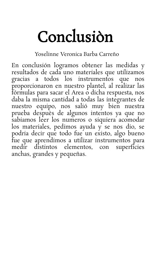 En conclusión logramos obtener las medidas y resultados de cada uno materiales que utilizamos gracias a todos los instrumentos que nos proporcionaron en nuestro plantel, al realizar las fórmulas para sacar el Area o dicha respuesta, nos daba la misma cantidad a todas las integrantes de nuestro equipo, nos salió muy bien nuestra prueba despuès de algunos intentos ya que no sabiamos leer los numeros o siquiera acomodar los materiales, pedimos ayuda y se nos dio, se podria decir que todo fue un existo, algo bueno fue que aprendimos a utilizar instrumentos para medir distintos elementos, con superficies anchas, grandes y pequeñas.