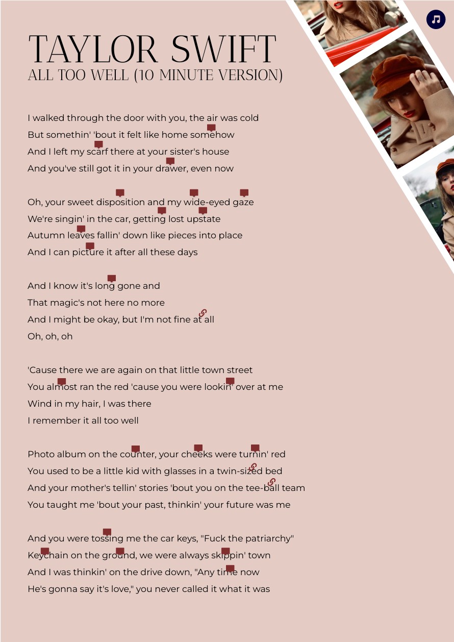 I walked through the door with you, the air was coldBut somethin' 'bout it felt like home somehow And I left my scarf there at your sister's house And you've still got it in your drawer, even now Oh, your sweet disposition and my wide-eyed gaze We're singin' in the car, getting lost upstate Autumn leaves fallin' down like pieces into place And I can picture it after all these days And I know it's long gone and That magic's not here no more And I might be okay, but I'm not fine at all Oh, oh, oh 'Causе there we arе again on that little town street You almost ran the red 'cause you were lookin' over at me Wind in my hair, I was there I remember it all too well Photo album on the counter, your cheeks were turnin' red You used to be a little kid with glasses in a twin-sized bed And your mother's tellin' stories 'bout you on the tee-ball team You taught me 'bout your past, thinkin' your future was me And you were tossing me the car keys, "Fuck the patriarchy" Keychain on the ground, we were always skippin' town And I was thinkin' on the drive down, "Any time now He's gonna say it's love," you never called it what it was