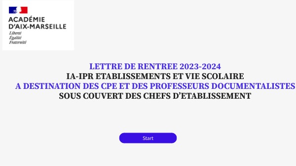 Mesdames, messieurs, Nous espérons que vous avez pu profiter pleinement des congés estivaux. Nous souhaitons la bienvenue aux conseillers principaux d’éducation et aux professeurs documentalistes qui prennent leurs fonctions dans l’académie d’Aix-Marseille et adressons également nos félicitations aux lauréats des CACPE et CAPES de documentation. Cette lettre de rentrée a pour objectif de vous informer des priorités de travail de l’année dans notre académie. Nous vous souhaitons une bonne rentrée et nous tenons à votre disposition pour vous accompagner tout au long de cette année scolaire 2023/2024. C.Bolusset-Gérenton, T. Dalmasso, L. Gomez, V. Maurin-Dulac, S-D. Noisette