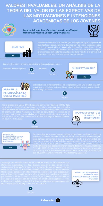 Entender los factores que contribuyen o mitigan las fugas tempranas de estudiantes de escuela primaria de minorías y bajo nivel socioeconómico en los campos de ciencia, tecnología, ingeniería y matemáticas (STEM) pudiendo explicar el cambio en las motivaciones académicas y las intenciones de completar la escuela secundaria y asistir a la universidad después de una intervención basada en computación.