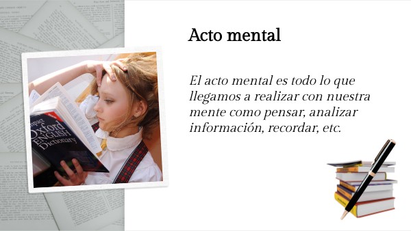 El acto mental es todo lo que llegamos a realizar con nuestra mente como pensar, analizar información, recordar, etc.