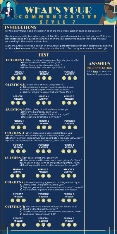 For this activity we need one person to share the screen. Work in pairs or groups of 3. This is a personality test where you will find the type of communicator that you are. With your classmates read the questions and the answers. Talk about the answer that best fits your personality in the situation described.