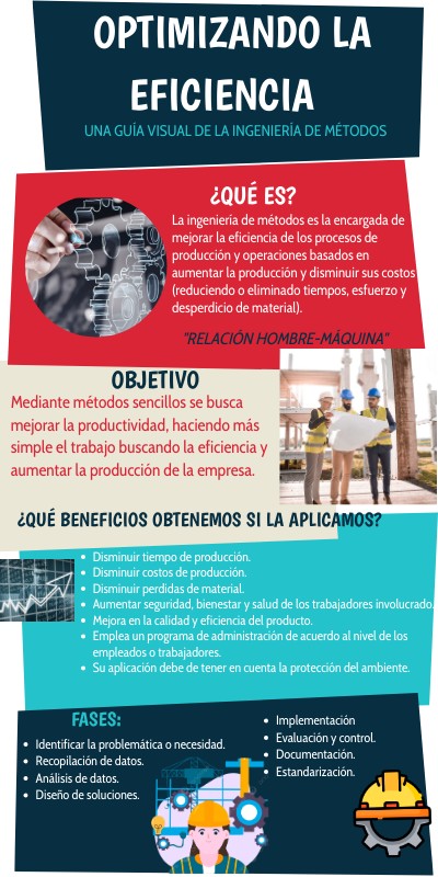 La ingeniería de métodos es la encargada de mejorar la eficiencia de los procesos de producción y operaciones basados en aumentar la producción y disminuir sus costos (reduciendo o eliminado tiempos, esfuerzo y desperdicio de material).