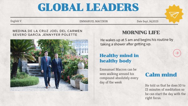 in the afternoon Macron goes to his house for eat with his wife. When he finishes, he meets with other politicians to resolve issues related to the country. Next, he goes to walk in the park for to clear his mind and return to his office. He checks his agenda and emails .