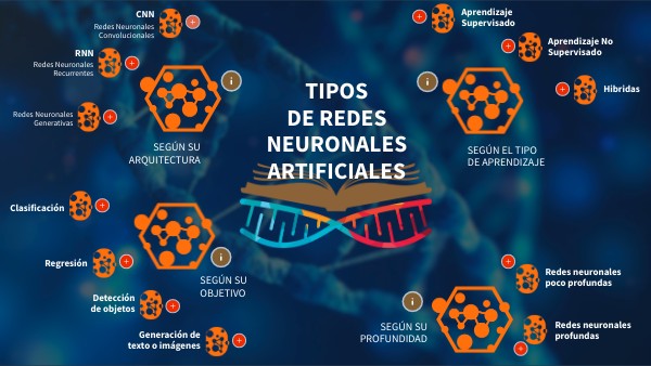 Redes Neuronales Artificiales Hibridas: Las redes neuronales híbridas combinan elementos de aprendizaje supervisado y no supervisado en su entrenamiento y arquitectura. Estas redes pueden aprovechar la capacidad de aprender estructuras o representaciones útiles a partir de datos no etiquetados y, al mismo tiempo, utilizar información supervisada para ajustar su rendimiento en una tarea específica. Algunos ejemplos de redes neuronales híbridas incluyen las redes neuronales semi-supervisadas, que utilizan datos etiquetados y no etiquetados durante el entrenamiento, y las redes neuronales reforzadas, que combinan el aprendizaje por refuerzo con el aprendizaje supervisado o no supervisado para aprender a tomar decisiones y maximizar recompensas.