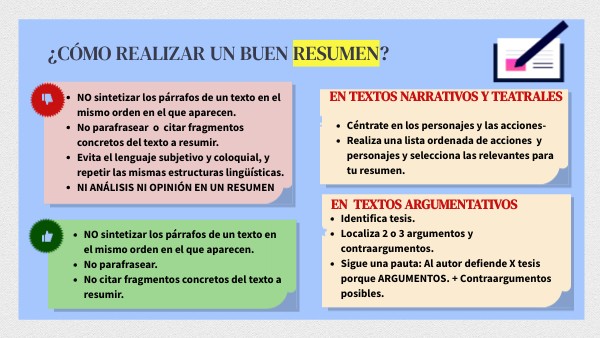 - NO sintetizar los párrafos de un texto en el mismo orden en el que aparecen.