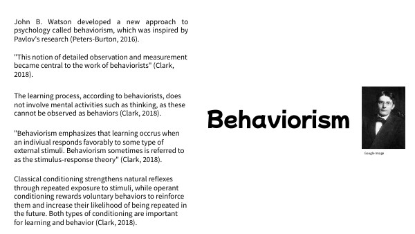 The learning process, according to behaviorists, does not involve mental activities such as thinking, as these cannot be observed as behaviors (Clark, 2018).
